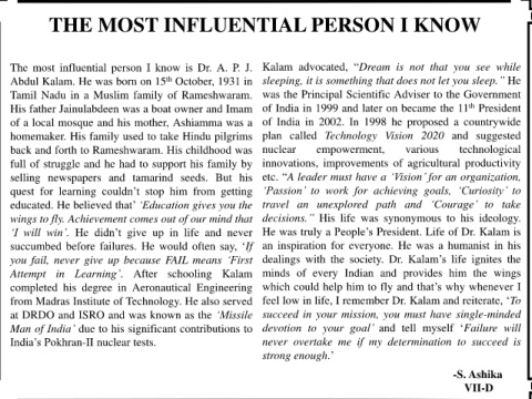 The most influential person I know is Dr. A. P. J. Kalam advocated, “Dream is not that you see while