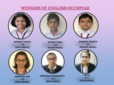 WINNERS OF ENGLISH OLYMPIAD RITANYA THAKUR DIVYAM YADAV SPANDAN TRIPATHI 5 B 5 D 5 C (GOLD MEDAL) (SILVER MEDAL) (BRONZE MEDAL) RIDDHIMA JAIN ABHIGYAN CHAKRABORTY DIVYA 6 C 6 A 6 C (GOLD MEDAL) (GOLD MEDAL) (GOLD MEDAL)