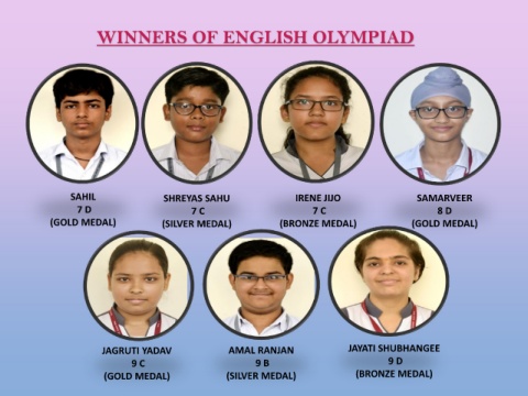 WINNERS OF ENGLISH OLYMPIAD SAHIL SHREYAS SAHU IRENE JIJO SAMARVEER 7 D 7 C 7 C 8 D (GOLD MEDAL) (SILVER MEDAL) (BRONZE MEDAL) (GOLD MEDAL) JAGRUTI YADAV AMAL RANJAN JAYATI SHUBHANGEE 9 C 9 B 9 D (GOLD MEDAL) (SILVER MEDAL) (BRONZE MEDAL)