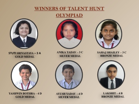 WINNERS OF TALENT HUNT OLYMPIAD STUTI SRIVASTAVA – 3 A ANIKA YADAV – 3 C SAHAJ SHAILEY – 3 C GOLD MEDAL SILVER MEDAL BRONZE MEDAL YASHWIN BOTHRA – 4 D AYUSH YADAV - 4 D LAKSHIT – 4 B GOLD MEDAL SILVER MEDAL BRONZE MEDAL