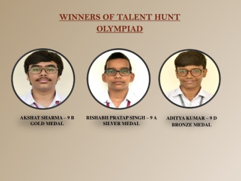 WINNERS OF TALENT HUNT OLYMPIAD AKSHAT SHARMA – 9 B RISHABH PRATAP SINGH – 9 A ADITYA KUMAR – 9 D GOLD MEDAL SILVER MEDAL BRONZE MEDAL