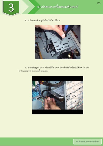3 การประกอบเครื่องคอมพิวเตอร์ 103 7.2 น าไขควงมาขันสกรูเพื่อยึดเข้ากับโครงให้แน่น ั 7.3 น าสายสัญญาณ SATA พร้อมปลั๊กไฟ SATA เสียบเข้ากบตัวเครื่องขับให้เรียบร้อย (ท า ในท านองเดียวกันกับการติดตั้งฮาร์ดดิสก์) คอมพิวเตอร์และการบ ารุงรักษา