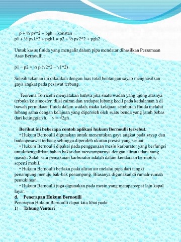 • Hukum Bernoulli berlaku pada aliran air melalui pipa dari tangki