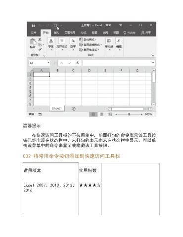 温馨提示 在快速访问工具栏的下拉菜单中,前面打勾的命令表示该工具按 钮已经出现在状态栏中,未打勾的表示尚未在状态栏中显示。可以单 击该菜单中的命令来显示或隐藏该工具按钮。 002 将常用命令按钮添加到快速访问工具栏 适用版本 实用指数 Excel 2007、2010、2013、 ★★★★☆ 2016