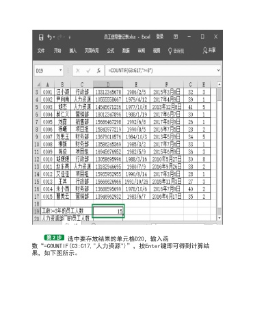 选中要存放结果的单元格D20,输入函 数“=COUNTIF(C3:C17,"人力资源")”,按Enter键即可得到计算结 果,如下图所示。