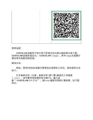 使用说明 COUNTBLANK函数用于统计某个区域中空白单元格的单元格个数。 COUNTBLANK函数的语法为:=COUNTBLANK(range),其中range为需要计 算空单元格数目的区域。 解决方法 例如,使用AVERAGE函数计算有效总成绩的人均分,具体操作方法 如下。 打开素材文件(位置:素材文件\第11章\新进员工考核表 1.xlsx),选中要存放结果的单元格C16,输入函 数“=COUNTBLANK(F4:F14)”,按Enter键即可得到计算结果,如下图 所示。