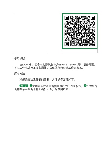 使用说明 在Excel中,工作表的默认名称为Sheet1、Sheet2等,根据需要, 可对工作表进行重命名操作,以便区分和查询工作表数据。 解决方法 如果要更改工作表的名称,具体操作方法如下。 使用鼠标右键单击要重命名的工作表标签; 在弹出的 快捷菜单中单击【重命名】命令,如下图所示。