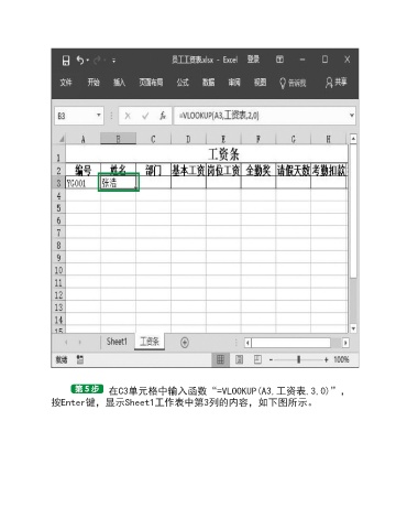 在C3单元格中输入函数“=VLOOKUP(A3,工资表,3,0)”, 按Enter键,显示Sheet1工作表中第3列的内容,如下图所示。