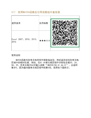 317 使用MATCH函数在引用或数组中查找值 适用版本 实用指数 Excel 2007、2010、2013、 2016 ★★★☆☆ 使用说明 MATCH函数可在单元格范围中搜索指定项,然后返回该项在单元格 区域中的相对位置。例如,在A1:A4单元格区域中分别包含值30、24、 58、39,在单元格中A4中输入函数“=MATCH(58,A1:A4,0)”,会返回 数字3,因为值58是单元格区域中的第3项,效果如下图所示。