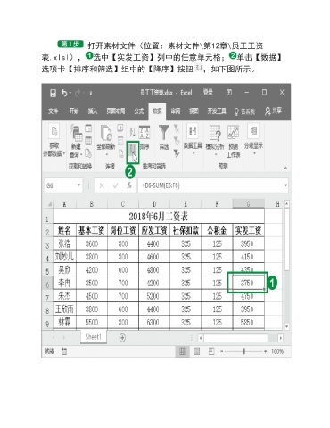 打开素材文件(位置:素材文件\第12章\员工工资 表.xlsl), 选中【实发工资】列中的任意单元格; 单击【数据】 选项卡【排序和筛选】组中的【降序】按钮 ,如下图所示。