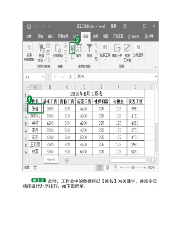 此时,工作表中的数据将以【姓名】为关键字,并按字母 顺序进行升序排列,如下图所示。