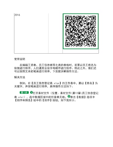 2016 使用说明 在编辑工资表、员工信息表等之类的表格时,若要以员工姓名为 依据进行排序,人们通常会按字母顺序进行排序。除此之外,我们还 可以按照文本的笔画进行排序,下面就讲解操作方法。 解决方法 例如,在【员工信息登记表.xlsx】的工作表中,要以【姓名】为 关键字,并按笔画进行排序,具体操作方法如下。 打开素材文件(位置:素材文件\第12章\员工信息登记 表.xlsl),选中数据区域中的任意单元格; 单击【数据】选项卡 【排序和筛选】组中的【排序】按钮,如下图所示。
