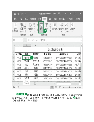 弹出【排序】对话框,在【主要关键字】下拉列表中选 择【姓名】选项,在【次序】下拉列表中选择【升序】选项; 单击 【选项】按钮,如下图所示。