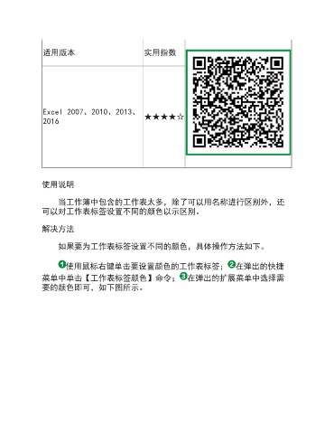 适用版本 实用指数 Excel 2007、2010、2013、 ★★★★☆ 2016 使用说明 当工作簿中包含的工作表太多,除了可以用名称进行区别外,还 可以对工作表标签设置不同的颜色以示区别。 解决方法 如果要为工作表标签设置不同的颜色,具体操作方法如下。 使用鼠标右键单击要设置颜色的工作表标签; 在弹出的快捷 菜单中单击【工作表标签颜色】命令; 在弹出的扩展菜单中选择需 要的颜色即可,如下图所示。