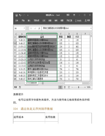 温馨提示 也可以按照字体颜色来排序,方法与使用单元格背景颜色排序相 同。 324 通过自定义序列排序数据 适用版本 实用指数