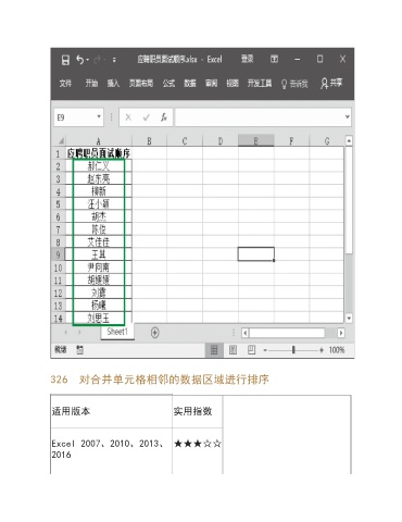 326 对合并单元格相邻的数据区域进行排序 适用版本 实用指数 Excel 2007、2010、2013、 ★★★☆☆ 2016