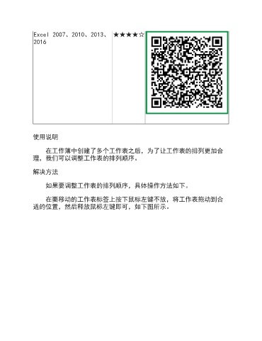 Excel 2007、2010、2013、 ★★★★☆ 2016 使用说明 在工作簿中创建了多个工作表之后,为了让工作表的排列更加合 理,我们可以调整工作表的排列顺序。 解决方法 如果要调整工作表的排列顺序,具体操作方法如下。 在要移动的工作表标签上按下鼠标左键不放,将工作表拖动到合 适的位置,然后释放鼠标左键即可,如下图所示。