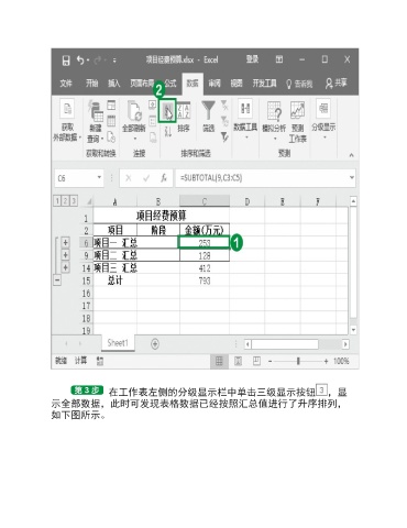 在工作表左侧的分级显示栏中单击三级显示按钮 ,显 示全部数据,此时可发现表格数据已经按照汇总值进行了升序排列, 如下图所示。