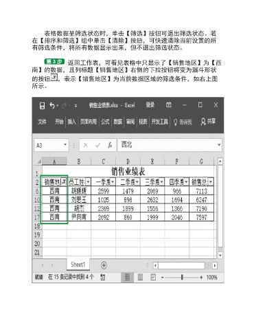 表格数据呈筛选状态时,单击【筛选】按钮可退出筛选状态。若 在【排序和筛选】组中单击【清除】按钮,可快速清除当前设置的所 有筛选条件,将所有数据显示出来,但不退出筛选状态。 返回工作表,可看见表格中只显示了【销售地区】为【西 南】的数据,且列标题【销售地区】右侧的下拉按钮将变为漏斗形状 的按钮 ,表示【销售地区】为当前数据区域的筛选条件,如右上图 所示。