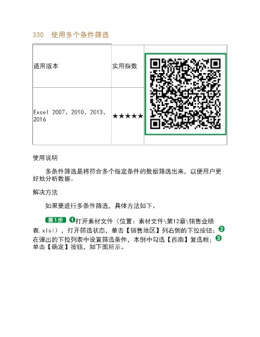 330 使用多个条件筛选 适用版本 实用指数 Excel 2007、2010、2013、 2016 ★★★★★ 使用说明 多条件筛选是将符合多个指定条件的数据筛选出来,以便用户更 好地分析数据。 解决方法 如果要进行多条件筛选,具体方法如下。 打开素材文件(位置:素材文件\第12章\销售业绩 表.xlsl),打开筛选状态,单击【销售地区】列右侧的下拉按钮; 在弹出的下拉列表中设置筛选条件,本例中勾选【西南】复选框; 单击【确定】按钮,如下图所示。