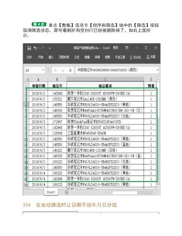 单击【数据】选项卡【排序和筛选】组中的【筛选】按钮 取消筛选状态,即可看到所有空白行已经被删除掉了,如右上图所 示。 334 在自动筛选时让日期不按年月日分组