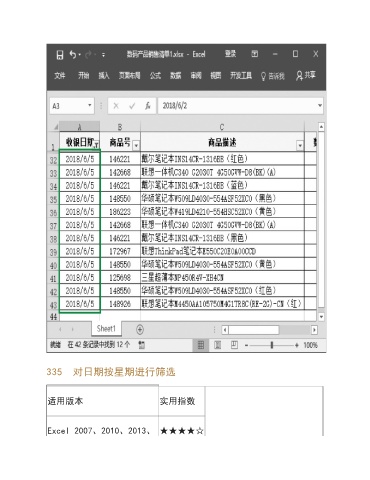 335 对日期按星期进行筛选 适用版本 实用指数 Excel 2007、2010、2013、 ★★★★☆