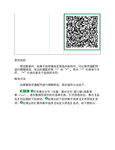 使用说明 筛选数据时,如果不能明确指定筛选的条件时,可以使用通配符 进行模糊筛选。常见的通配符有“?”和“*”,其中“?”代表单个字 符,“*”代表任意多个连续的字符。 解决方法 如果要使用通配符进行模糊筛选,具体操作方法如下。 打开素材文件(位置:素材文件\第12章\销售清 单.xlsx),选中数据区域中的任意单元格,打开筛选状态,单击【品 名】列右侧的下拉按钮; 在弹出的下拉列表中选择【文本筛选】选 项; 在弹出的扩展列表中选择【自定义筛选】选项,如下图所示。