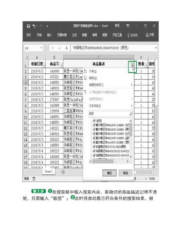 在搜索框中输入搜索内容,若确切的商品描述记得不清 楚,只需输入“联想”; 此时将自动显示符合条件的搜索结果,根