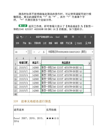 筛选时如果不能明确指定筛选的条件时,可以使用通配符进行模 糊筛选。常见的通配符有“?”和“*”,其中“?”代表单个字 符,“*”代表任意多个连续字符。 返回工作表,即可查看只显示了【商品描述】为【联想一 体机C340 G2030T 4G50GVW-D8(BK)(A)】的数据,如下图所示。 339 按单元格颜色进行筛选 适用版本 实用指数 Excel 2007、2010、2013、 ★★★☆☆ 2016