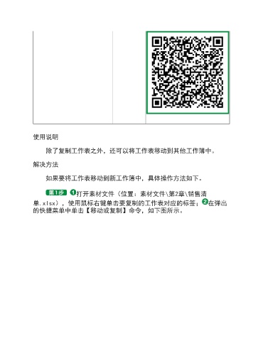 使用说明 除了复制工作表之外,还可以将工作表移动到其他工作簿中。 解决方法 如果要将工作表移动到新工作簿中,具体操作方法如下。 打开素材文件(位置:素材文件\第2章\销售清 单.xlsx),使用鼠标右键单击要复制的工作表对应的标签; 在弹出 的快捷菜单中单击【移动或复制】命令,如下图所示。