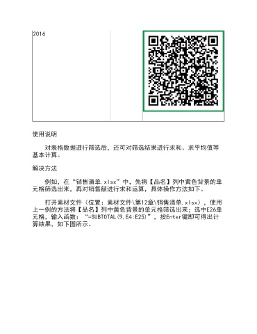 2016 使用说明 对表格数据进行筛选后,还可对筛选结果进行求和、求平均值等 基本计算。 解决方法 例如,在“销售清单.xlsx”中,先将【品名】列中黄色背景的单 元格筛选出来,再对销售额进行求和运算,具体操作方法如下。 打开素材文件(位置:素材文件\第12章\销售清单.xlsx),使用 上一例的方法将【品名】列中黄色背景的单元格筛选出来;选中E26单 元格,输入函数:“=SUBTOTAL(9,E4:E25)”,按Enter键即可得出计 算结果,如下图所示。