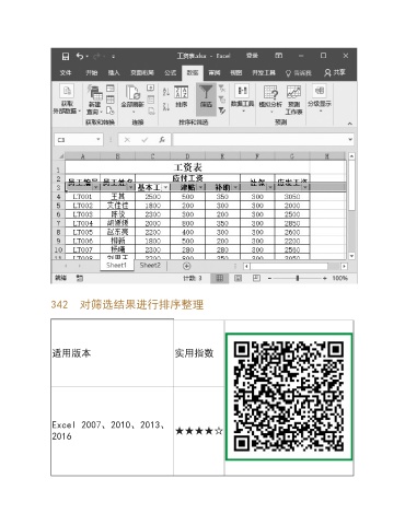 342 对筛选结果进行排序整理 适用版本 实用指数 Excel 2007、2010、2013、 2016 ★★★★☆