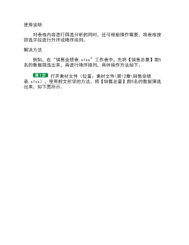 使用说明 对表格内容进行筛选分析的同时,还可根据操作需要,将表格按 筛选字段进行升序或降序排列。 解决方法 例如,在“销售业绩表.xlsx”工作表中,先将【销售总量】前5 名的数据筛选出来,再进行降序排列,具体操作方法如下。 打开素材文件(位置:素材文件\第12章\销售业绩 表.xlsx),使用前文所学的方法,将【销售总量】前5名的数据筛选 出来,如下图所示。