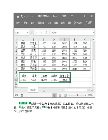 新建一个名为【筛选结果】的工作表,并切换到该工作 表; 选中任意单元格; 单击【排序和筛选】组中的【高级】按钮 ,如下图所示。