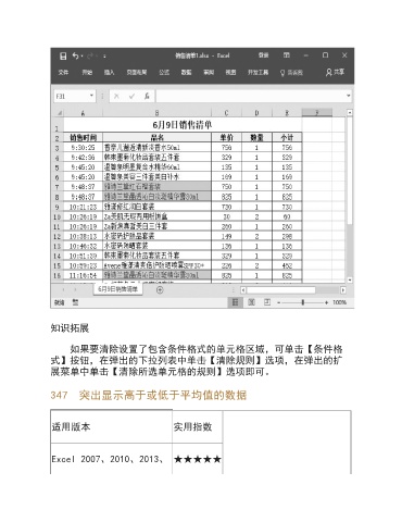 知识拓展 如果要清除设置了包含条件格式的单元格区域,可单击【条件格 式】按钮,在弹出的下拉列表中单击【清除规则】选项,在弹出的扩 展菜单中单击【清除所选单元格的规则】选项即可。 347 突出显示高于或低于平均值的数据 适用版本 实用指数 Excel 2007、2010、2013、 ★★★★★