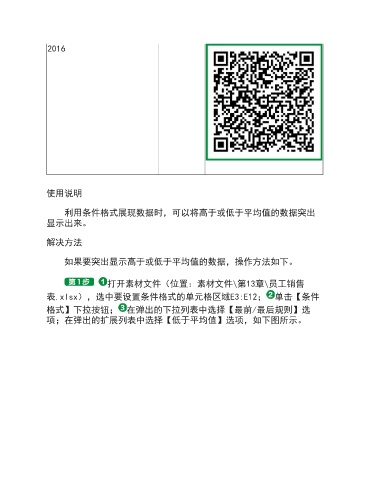 2016 使用说明 利用条件格式展现数据时,可以将高于或低于平均值的数据突出 显示出来。 解决方法 如果要突出显示高于或低于平均值的数据,操作方法如下。 打开素材文件(位置:素材文件\第13章\员工销售 表.xlsx),选中要设置条件格式的单元格区域E3:E12; 单击【条件 格式】下拉按钮; 在弹出的下拉列表中选择【最前/最后规则】选 项;在弹出的扩展列表中选择【低于平均值】选项,如下图所示。