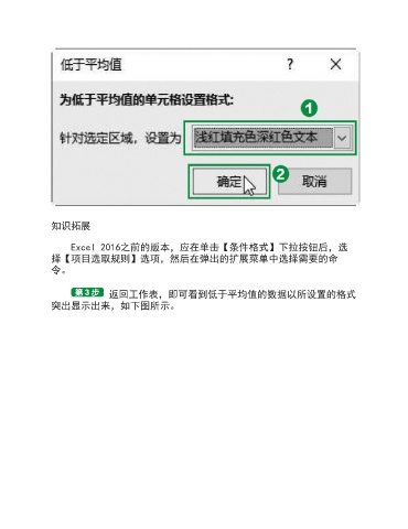 知识拓展 Excel 2016之前的版本,应在单击【条件格式】下拉按钮后,选 择【项目选取规则】选项,然后在弹出的扩展菜单中选择需要的命 令。 返回工作表,即可看到低于平均值的数据以所设置的格式 突出显示出来,如下图所示。