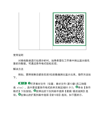 使用说明 对表格数据进行处理分析时,如果希望在工作表中突出显示排名 靠前的数据,可通过条件格式轻松实现。 解决方法 例如,要将销售总额排名前3位的数据突出显示出来,操作方法如 下。 打开素材文件(位置:素材文件\第13章\员工销售 表.xlsx),选中要设置条件格式的单元格区域D3:D12; 单击【条件 格式】下拉按钮; 在弹出的下拉列表中选择【最前/最后规则】选 项; 在弹出的扩展列表中选择【前10项】选项,如下图所示。