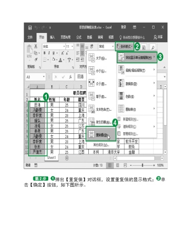 弹出【重复值】对话框,设置重复值的显示格式; 单 击【确定】按钮,如下图所示。