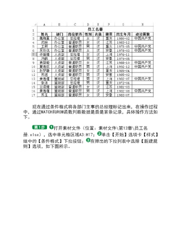 现在通过条件格式将各部门主事的总经理标记出来,在操作过程 中,通过MATCH和ROW函数判断数据是否是首条记录,具体操作方法如 下。 打开素材文件(位置:素材文件\第13章\员工名 册.xlsx),选中单元格区域A3:H17; 单击【开始】选项卡【样式】 组中的【条件格式】下拉按钮; 在弹出的下拉列表中选择【新建规 则】选项,如下图所示。