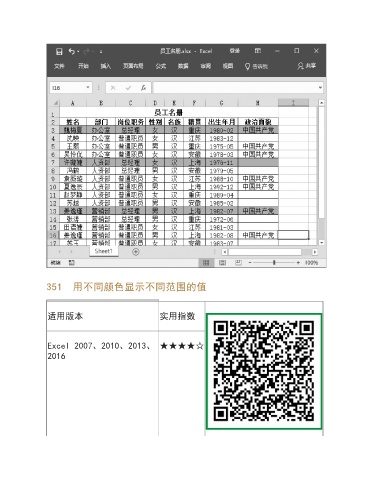 351 用不同颜色显示不同范围的值 适用版本 实用指数 Excel 2007、2010、2013、 ★★★★☆ 2016