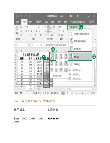 352 复制条件格式产生的颜色 适用版本 实用指数 Excel 2007、2010、2013、 ★★★★☆ 2016