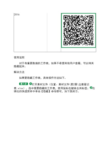 2016 使用说明 对于有重要数据的工作表,如果不希望其他用户查看,可以将其 隐藏起来。 解决方法 如果要隐藏工作表,具体操作方法如下。 打开素材文件(位置:素材文件\第2章\出差登记 表.xlsx),选中需要隐藏的工作表,使用鼠标右键单击其标签; 在 弹出的快捷菜单中单击【隐藏】命令即可,如下图所示。