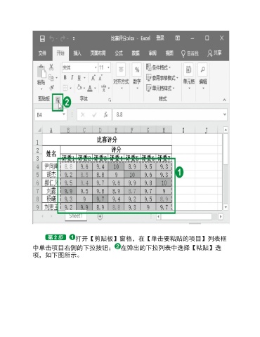 打开【剪贴板】窗格,在【单击要粘贴的项目】列表框 中单击项目右侧的下拉按钮; 在弹出的下拉列表中选择【粘贴】选 项,如下图所示。