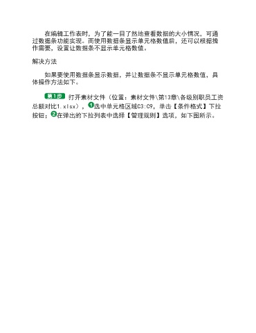 在编辑工作表时,为了能一目了然地查看数据的大小情况,可通 过数据条功能实现。而使用数据条显示单元格数值后,还可以根据操 作需要,设置让数据条不显示单元格数值。 解决方法 如果要使用数据条显示数据,并让数据条不显示单元格数值,具 体操作方法如下。 打开素材文件(位置:素材文件\第13章\各级别职员工资 总额对比1.xlsx), 选中单元格区域C3:C9,单击【条件格式】下拉 按钮; 在弹出的下拉列表中选择【管理规则】选项,如下图所示。