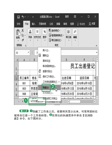 隐藏了工作表之后,若要将其显示出来,可使用鼠标右 键单击任意一个工作表标签; 在弹出的快捷菜单中单击【取消隐 藏】命令,如下图所示。