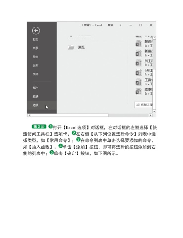 打开【Excel选项】对话框,在对话框的左侧选择【快 速访问工具栏】选项卡; 在右侧【从下列位置选择命令】列表中选 择类型,如【常用命令】; 在命令列表中单击选择要添加的命令, 如【插入函数】; 单击【添加】按钮,即可将选择的按钮添加到右 侧的列表中; 单击【确定】按钮,如下图所示。