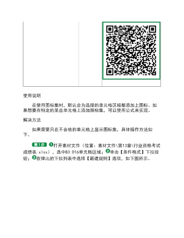 使用说明 在使用图标集时,默认会为选择的单元格区域都添加上图标。如 果想要在特定的某些单元格上添加图标集,可以使用公式来实现。 解决方法 如果需要只在不合格的单元格上显示图标集,具体操作方法如 下。 打开素材文件(位置:素材文件\第13章\行业资格考试 成绩表.xlsx),选中B3:D16单元格区域; 单击【条件格式】下拉按 钮; 在弹出的下拉列表中选择【新建规则】选项,如下图所示。