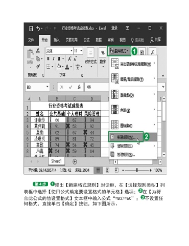 弹出【新建格式规则】对话框,在【选择规则类型】列 表框中选择【使用公式确定要设置格式的单元格】选项; 在【为符 合此公式的值设置格式】文本框中输入公式“=B3>=60”; 不设置任 何格式,直接单击【确定】按钮,如下图所示。