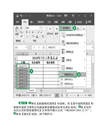 弹出【新建格式规则】对话框,在【选中规则类型】列 表框中选择【使用公式确定要设置格式的单元格】选项; 在【为符 合此公式的值设置格式】文本框中输入公式“=WEEKDAY($A3,2)>5”; 单击【格式】按钮,如下图所示。